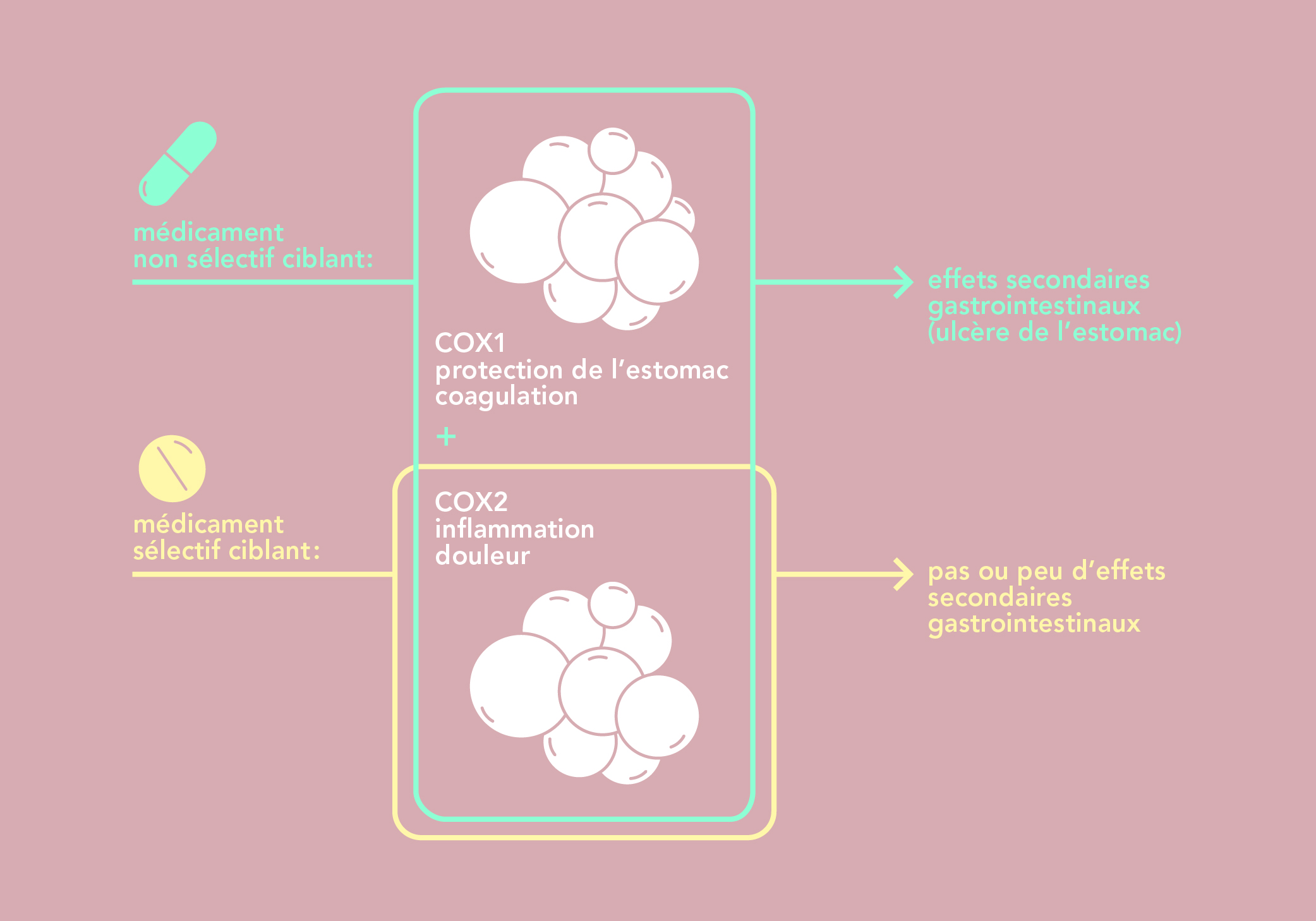 En bloquant conjointement COX1 et COX2, l’acide salicylique a certes les effets souhaités anti-douleur, anti-inflammatoire et anti-fièvre, mais il provoque des effets indésirables sur l’estomac et la coagulation.