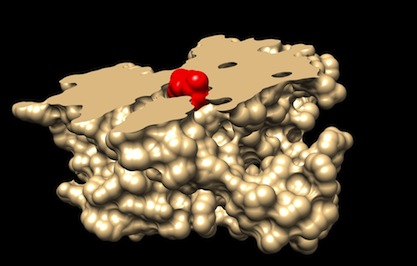 Modèle 3D informatique de la liaison de l'ibuprofène (en rouge) dans COX1 (coupe, en beige) (PDB 1EQG).
