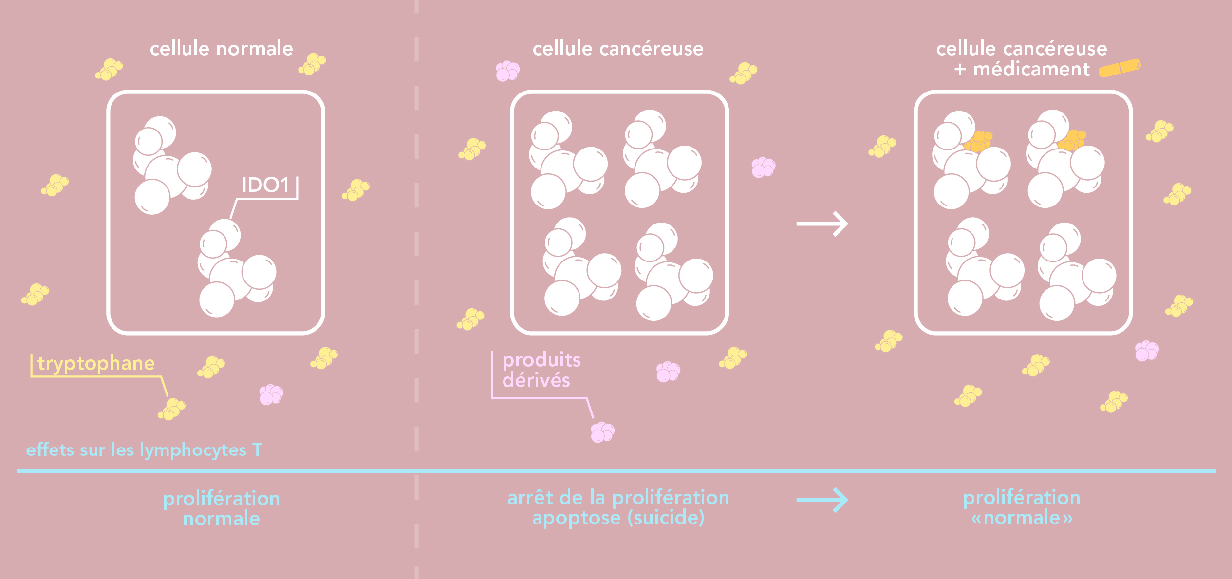 Le système immunitaire joue un rôle clé dans la lutte contre le cancer: il traque et élimine les cellules cancéreuses. Mais ces dernières déploient toute une série d’astuces pour échapper à sa vigilance.De nombreuses cellules cancéreuses produisent la protéine indoleamine 2,3-dioxygenase 1 (IDO1) en grande quantité. Un taux élevé d’IDO1 dans une tumeur est souvent lié à un mauvais pronostique. Pourquoi? IDO1 est une protéine impliquée dans la dégradation de l'acide aminé tryptophane. Le tryptophane est un acide aminé essentiel: il doit être en quantité suffisante pour que les cellules puissent se diviser normalement. Dans l’environnement d’une cellule cancéreuse produisant IDO1 en grande quantité, la baisse de la concentration de tryptophane entraîne un arrêt de la prolifération des cellules du système immunitaire (lymphocytes T). De plus, certains produits dérivés de la dégradation du tryptophane sont directement toxiques pour les lymphocytes T.