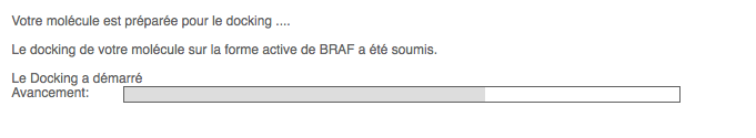 Vous avez dessiné votre propre molécule: afin de prédire le mode de liaison de votre molécule, un calcul de docking est lancé sur un ordinateur distant grâce à l'Internet (plusieurs dizaines de milliers de géométries et de positions de la petite molécule dans la protéine sont évaluées par AutoDock Vina!). Si tous les processeurs sont utilisés par des dockings, le texte mentionne la longueur de la liste d'attente. Lorsqu'une place se libère, le calcul proprement dit démarre et une barre dynamique montre son avancement.