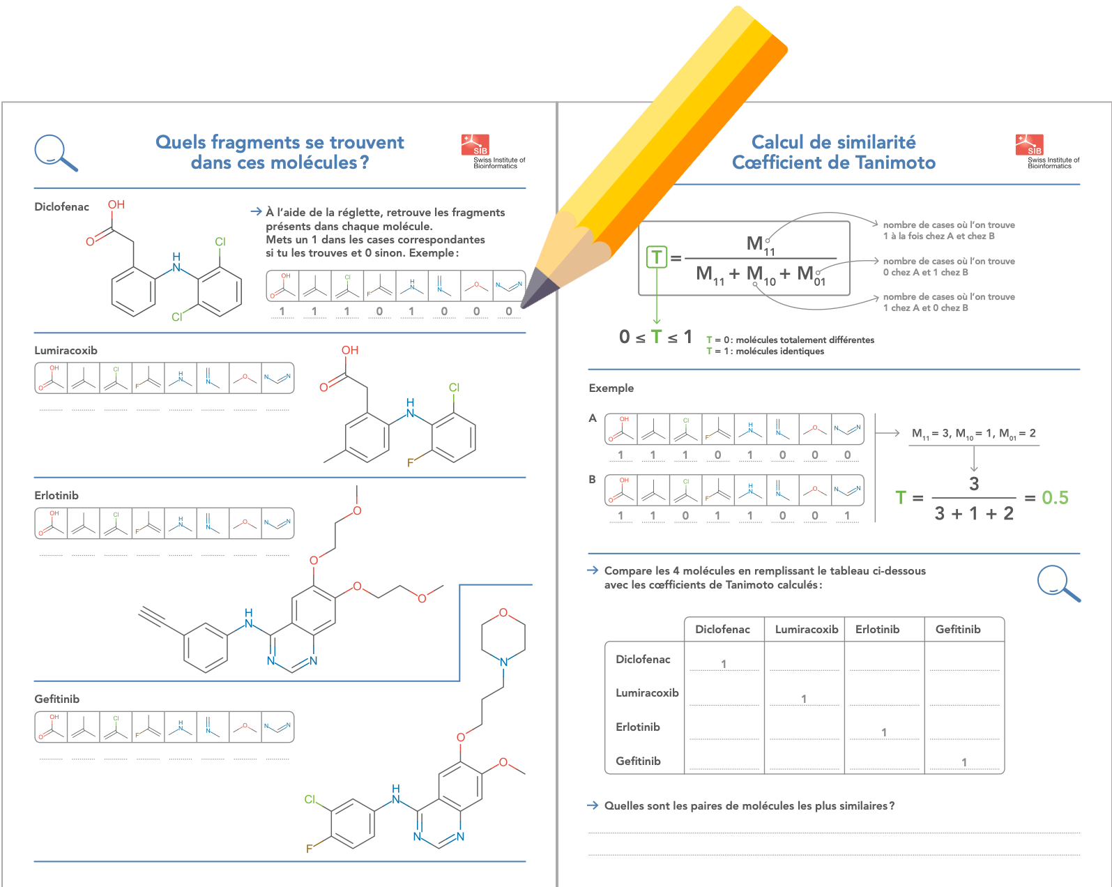 Cet exercice montre comment un ordinateur traduit les molécules en vecteurs de 0 et de 1, en trouvant quels fragments sont presents dans une molécule.En comparant les vecteurs (aussi appelés Fingerprints), l'ordinateur est capable de quantifier la similarité entre molécules.